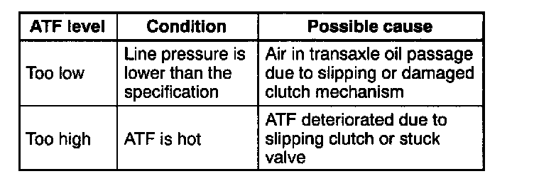 Note: If the ATF level is too high or too low when hot, the cause of the following problems are shown on the next page.