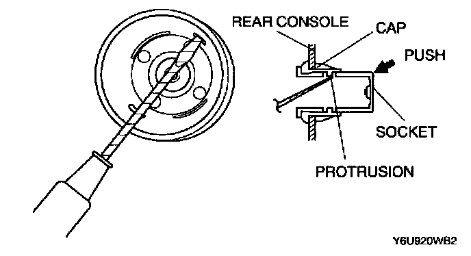 1. While pushing the protrusion through one of the holes using a tape-wrapped flathead screwdriver, push the back of the socket to disengage the cap from the socket.