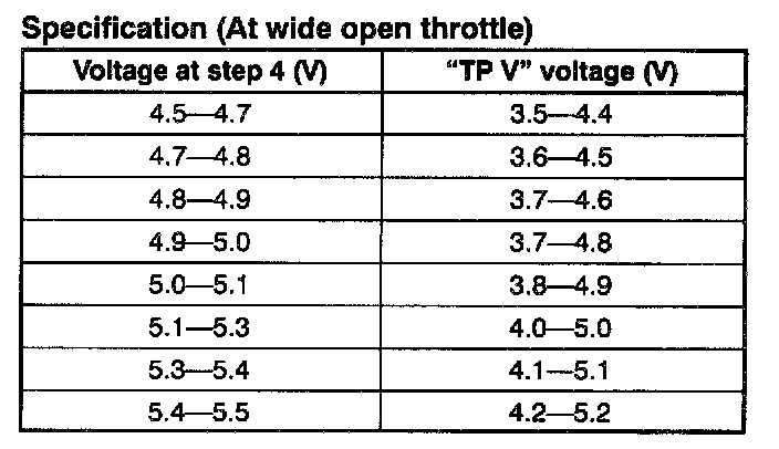 7. When the throttle valve is at the wide open throttle, verify that the "TP V" voltage is in the specification.