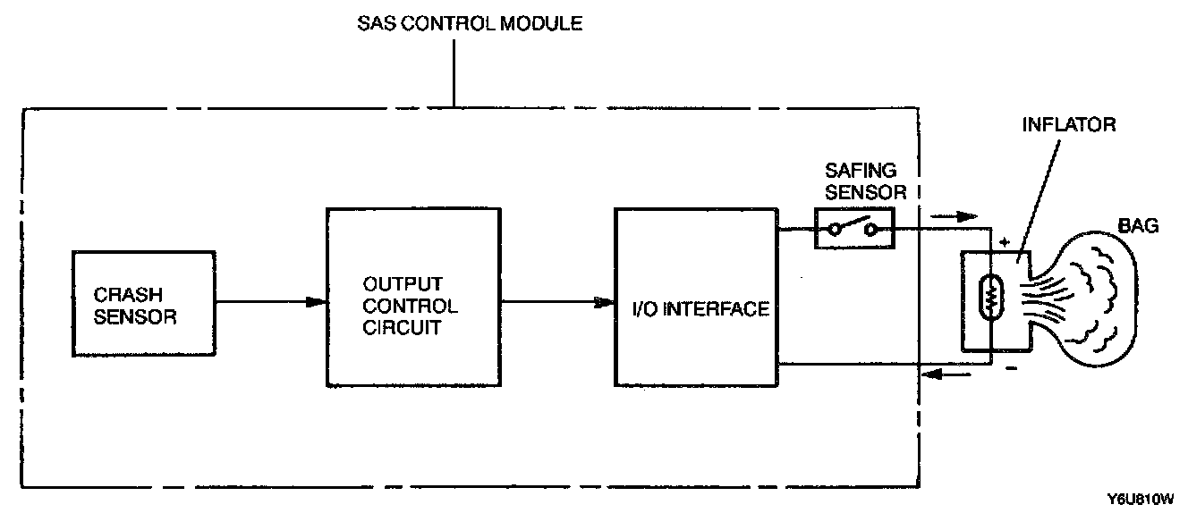 When the crash sensor in the SAS control module detects vehicle deceleration due to the shock of a collision, it outputs an electric signal and simultaneously, the safing sensor detects this and turns ON.