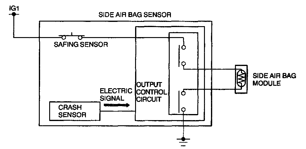1. When the vehicle is involved in a collision from the side, the safing sensor detects the collision to activate the unit. Simultaneously, the crash sensor within the side air bag sensor detects the deceleration, converts this information into an electric signal, then outputs it.
