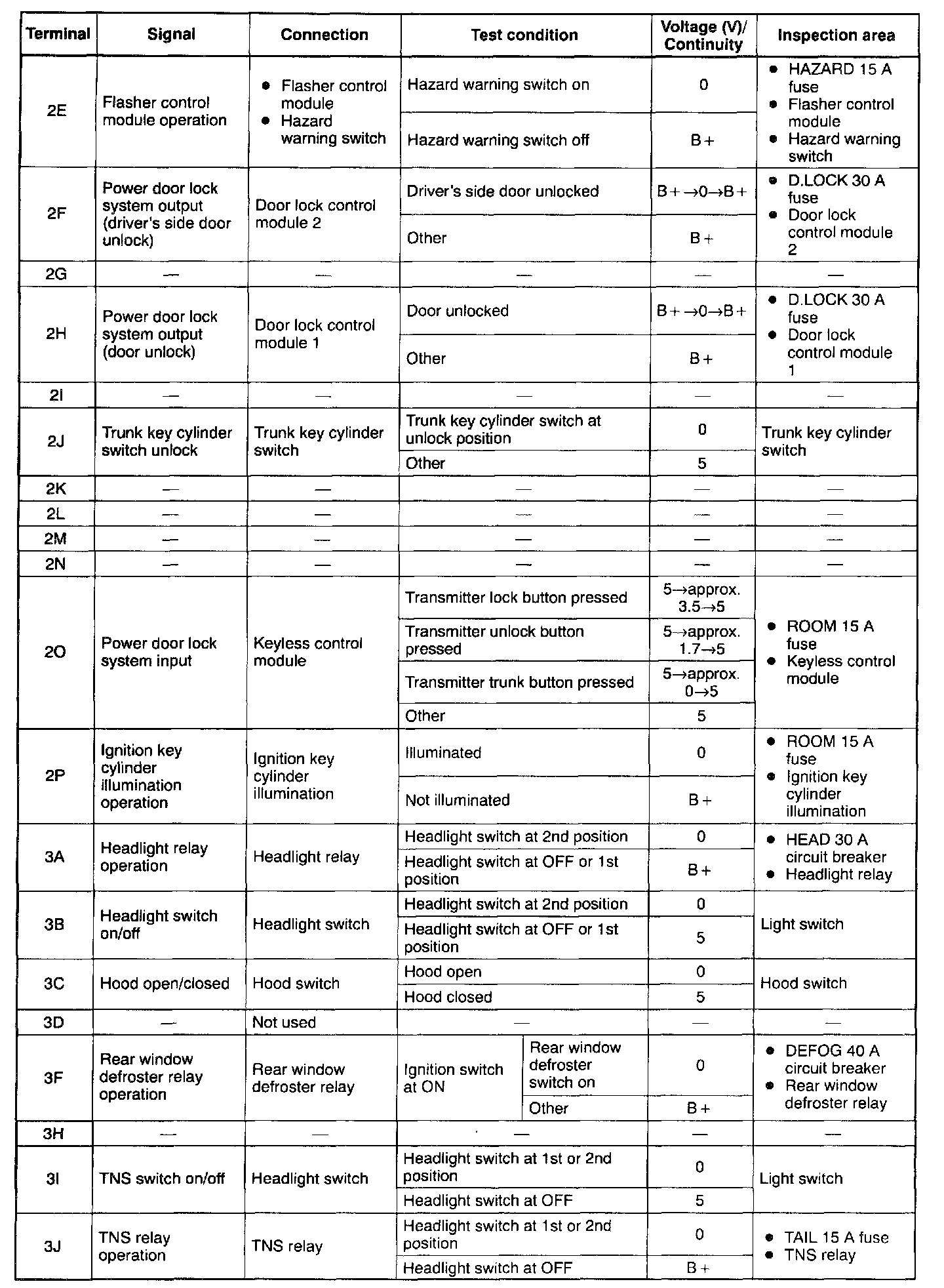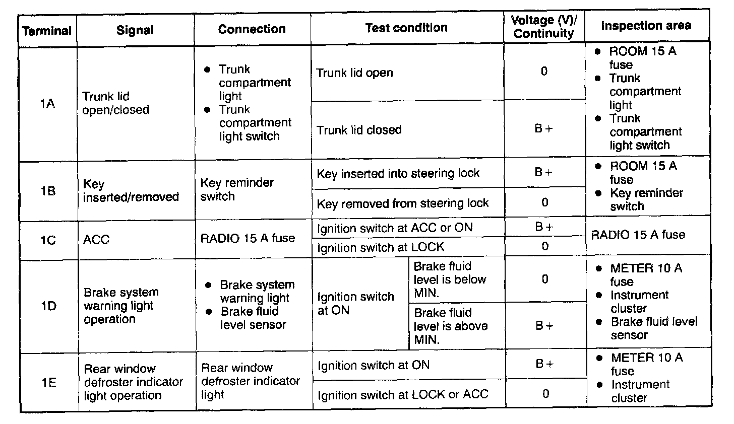 5. If not as specified, inspect the parts listed under Inspection area" and the related wiring harnesses.