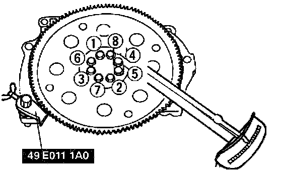 2. Tighten the drive plate mounting bolts in two or three steps in the order shown.