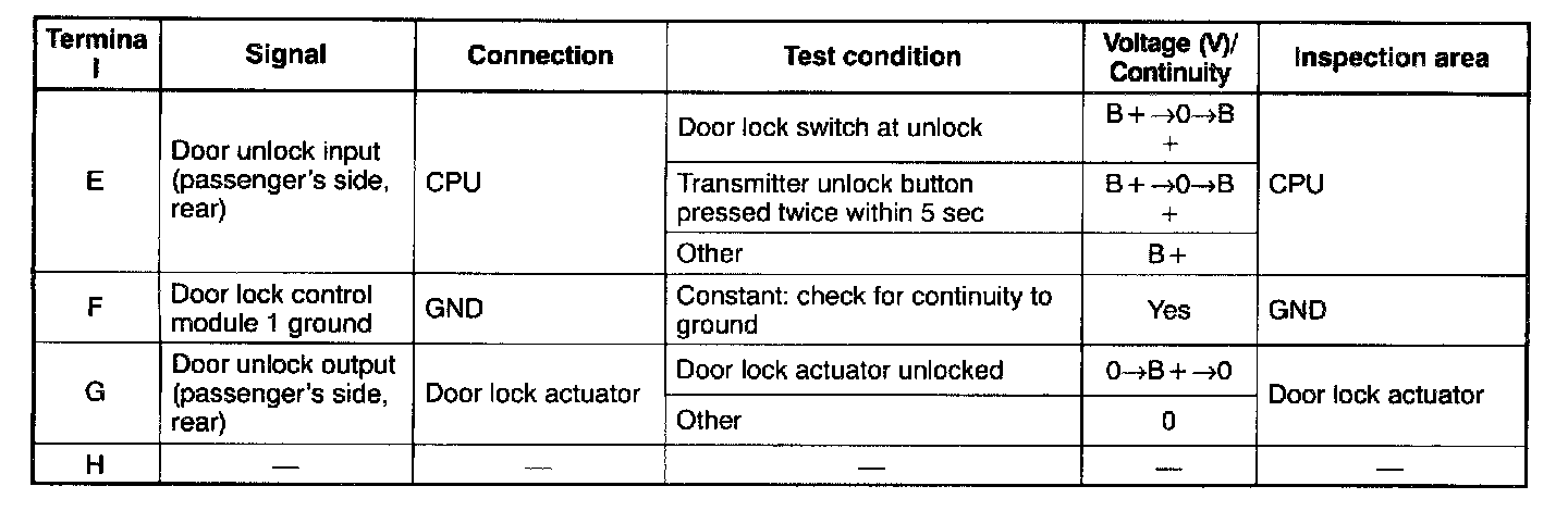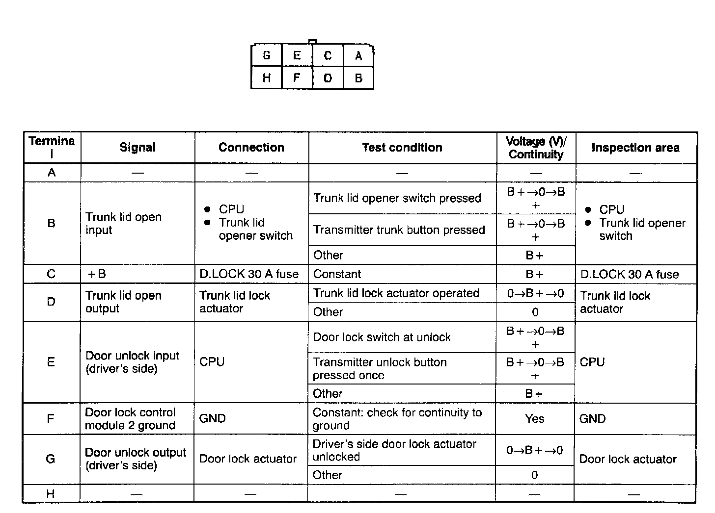 NOTE: Disconnect the door lock control module 1 connector before checking for continuity at terminal F.Terminal Pinouts: