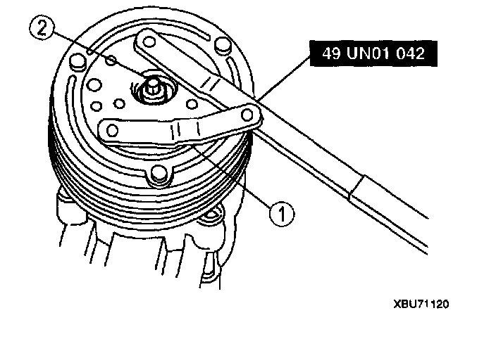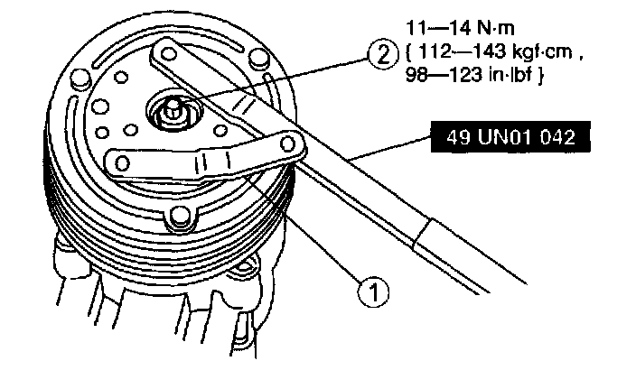 1. Hold the A/C clutch hub with the Spanner Wrench SST-49-UN-1-042.