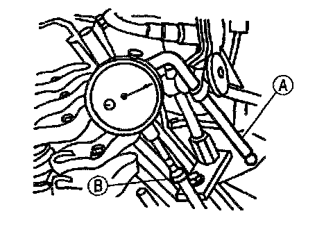 3. Make sure the valve tappet is seated against the camshaft. Install a suitable Dial Indicator with Bracketry (A) so the ball socket adapter of the indicator is on top of the valve tappet or Cup Shaped Adapter (B) is on top of the push rod and in the same plane as the valve tappet push rod movement.