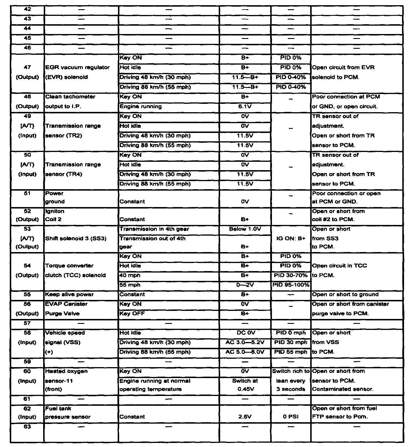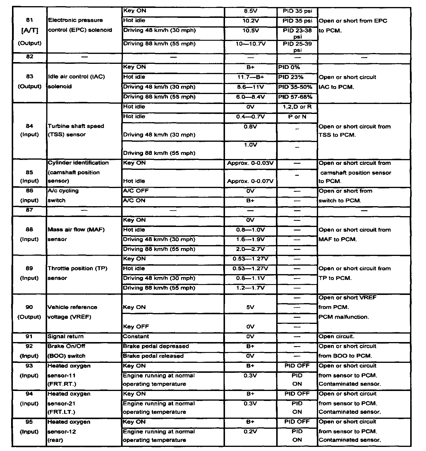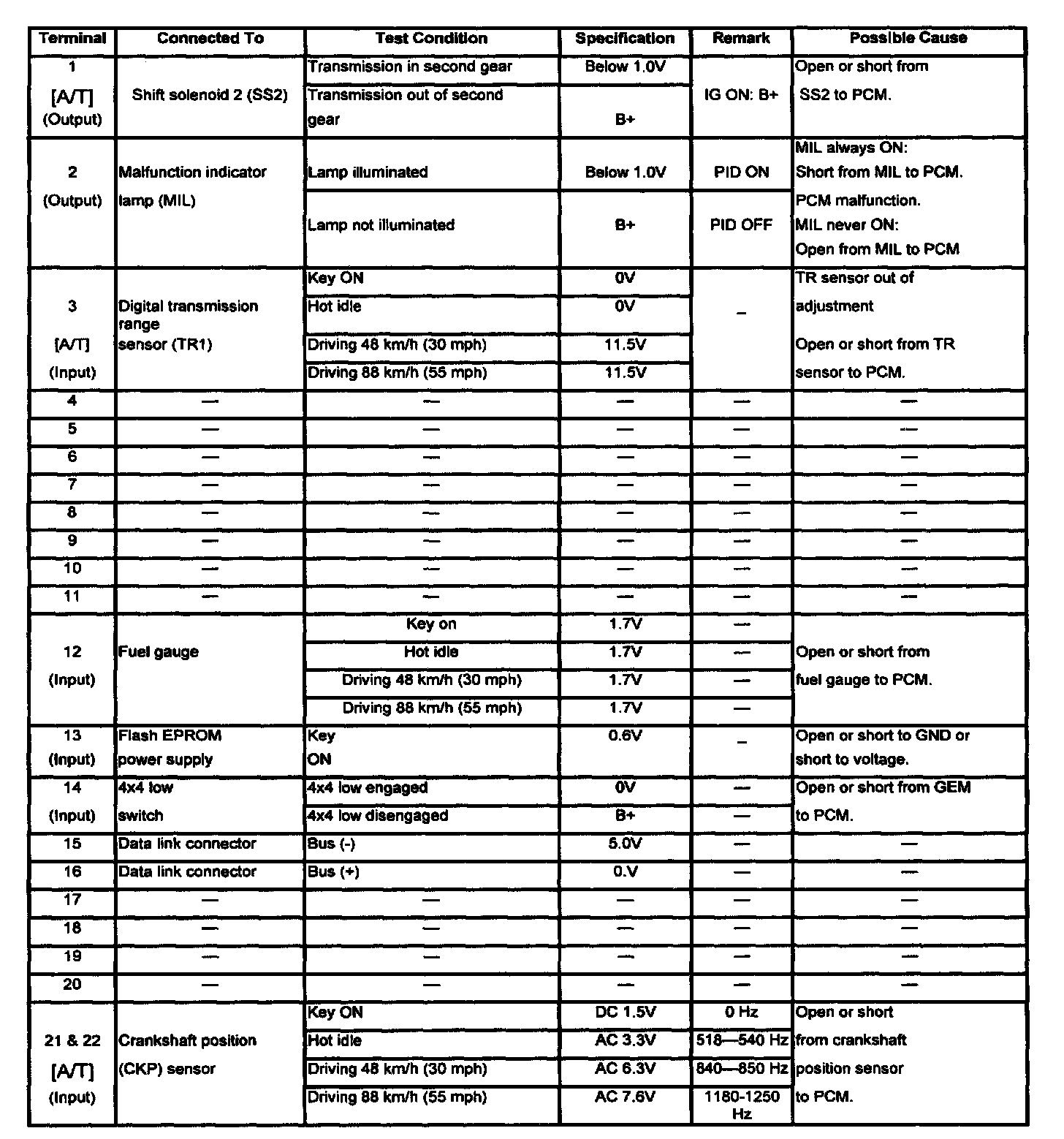 POWERTRAIN CONTROL MODULE (PCM) INSPECTIONCAUTION: The PCM terminal voltages vary with change in measuring conditions and vehicle conditions. Always carry out a total inspection of the input systems, output systems, and PCM to determine the cause of trouble. Otherwise, a wrong diagnosis will be made.