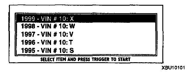 4. Move the cursor to 1999 - VIN # 10:X. Press the trigger key, enter this selection.