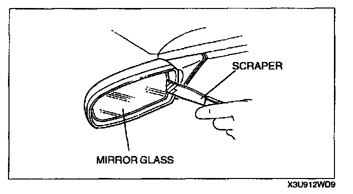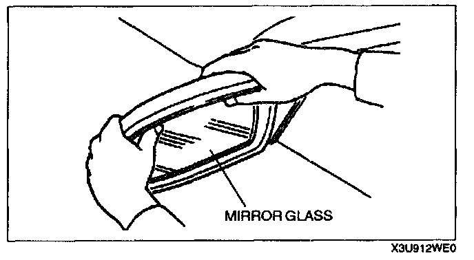 OUTSIDE MIRROR GLASS REMOVAL1. Warm the frame and the mirror glass to approximately 70 °C {158 °F} for 3 minutes using a hot air blower.