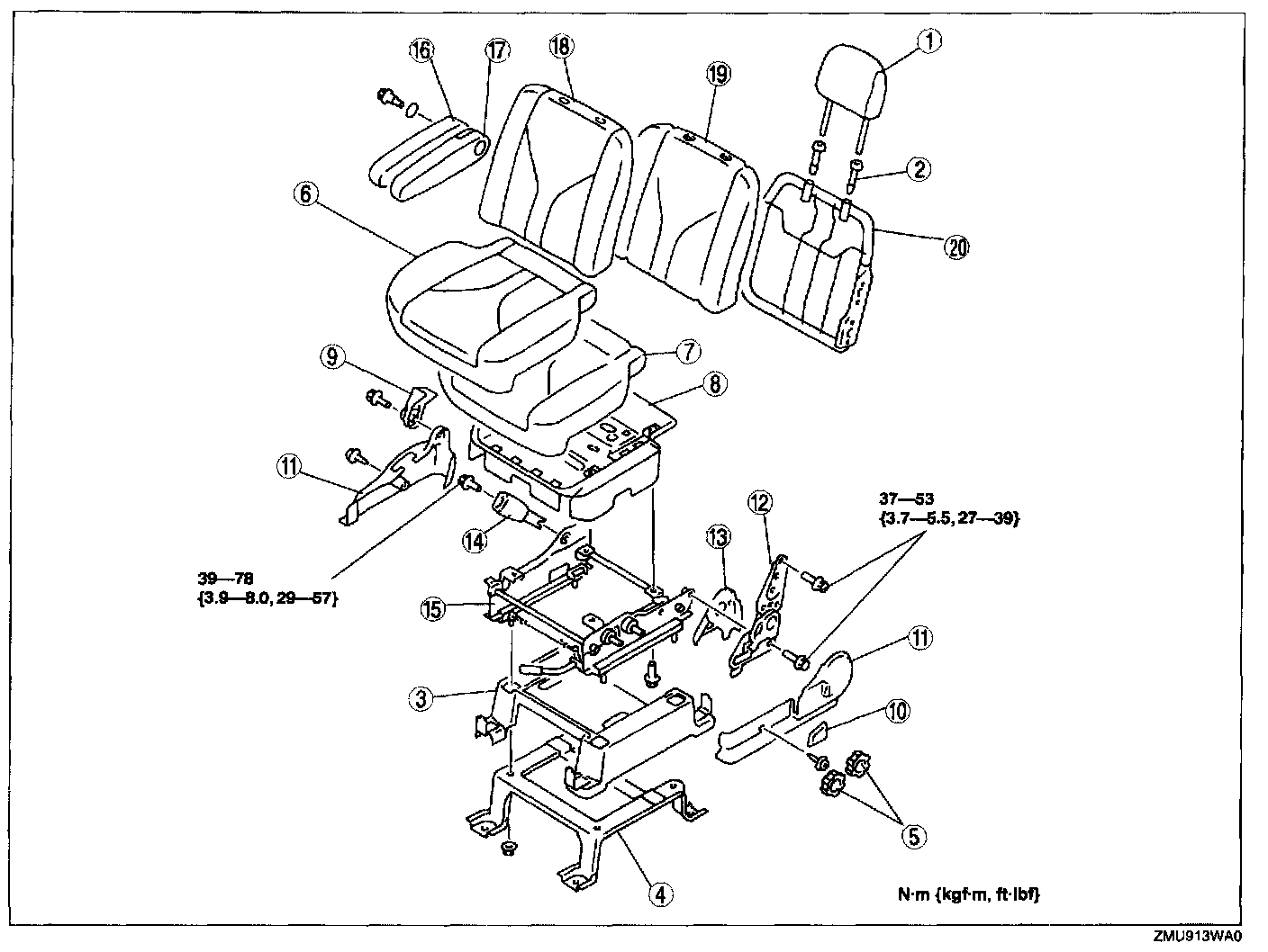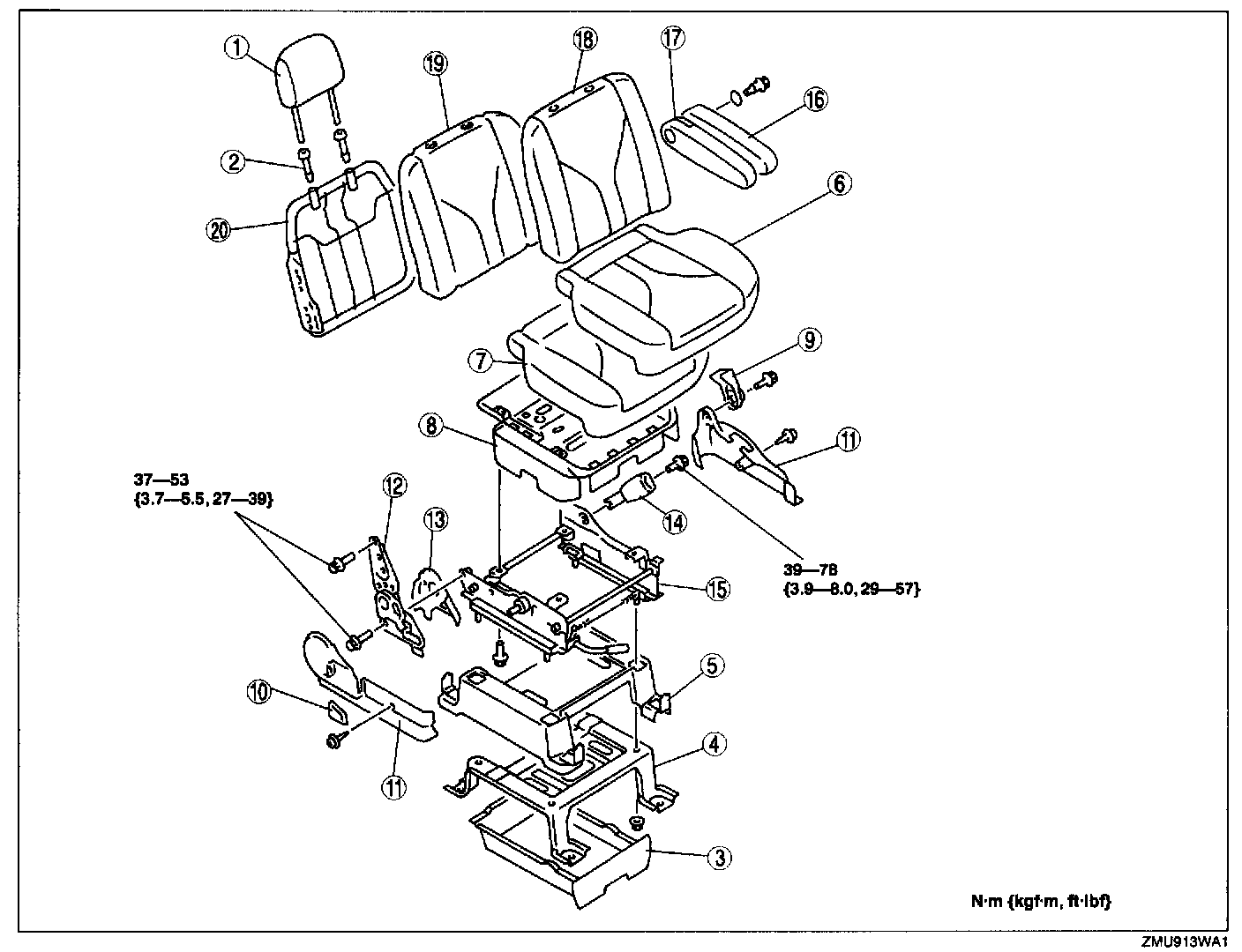 Driver's SeatWARNING: Handling the front seat (side air bag) improperly can accidentally deploy the side air bag, which may seriously injure you. Read AIR BAG SYSTEM SERVICE WARNINGS before handling the front seat.