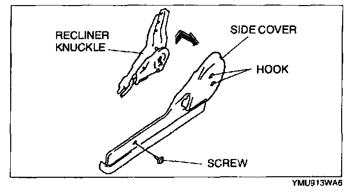 2. Lift the side cover up in the direction shown by the arrow, then unhook it from the recliner knuckle.
