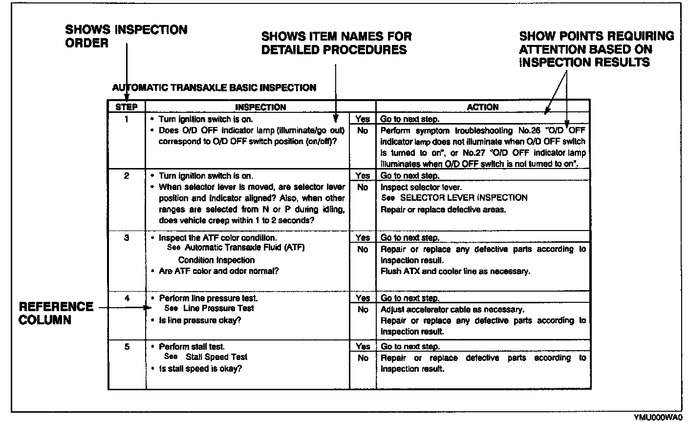 - Although inspections and adjustments are performed according to the reference column procedures, if the cause of the malfunction is discovered during basic inspection, continue the procedures as indicated in the remarks column.