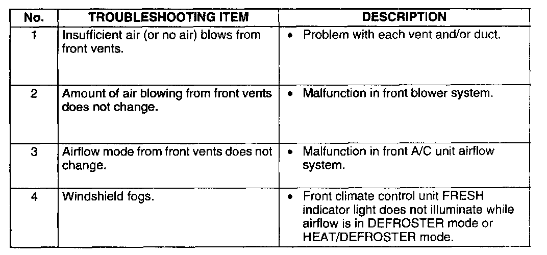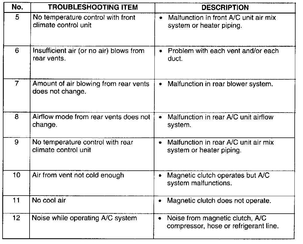 - The areas for inspection (steps) are given according to various circuit malfunctions. Use the chart below to verify the symptoms of the trouble in order to diagnose the appropriate area.