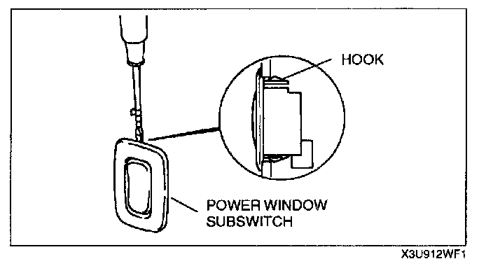 2. Remove the hook by inserting a tape-wrapped flathead screwdriver between the switch and the rear door trim.