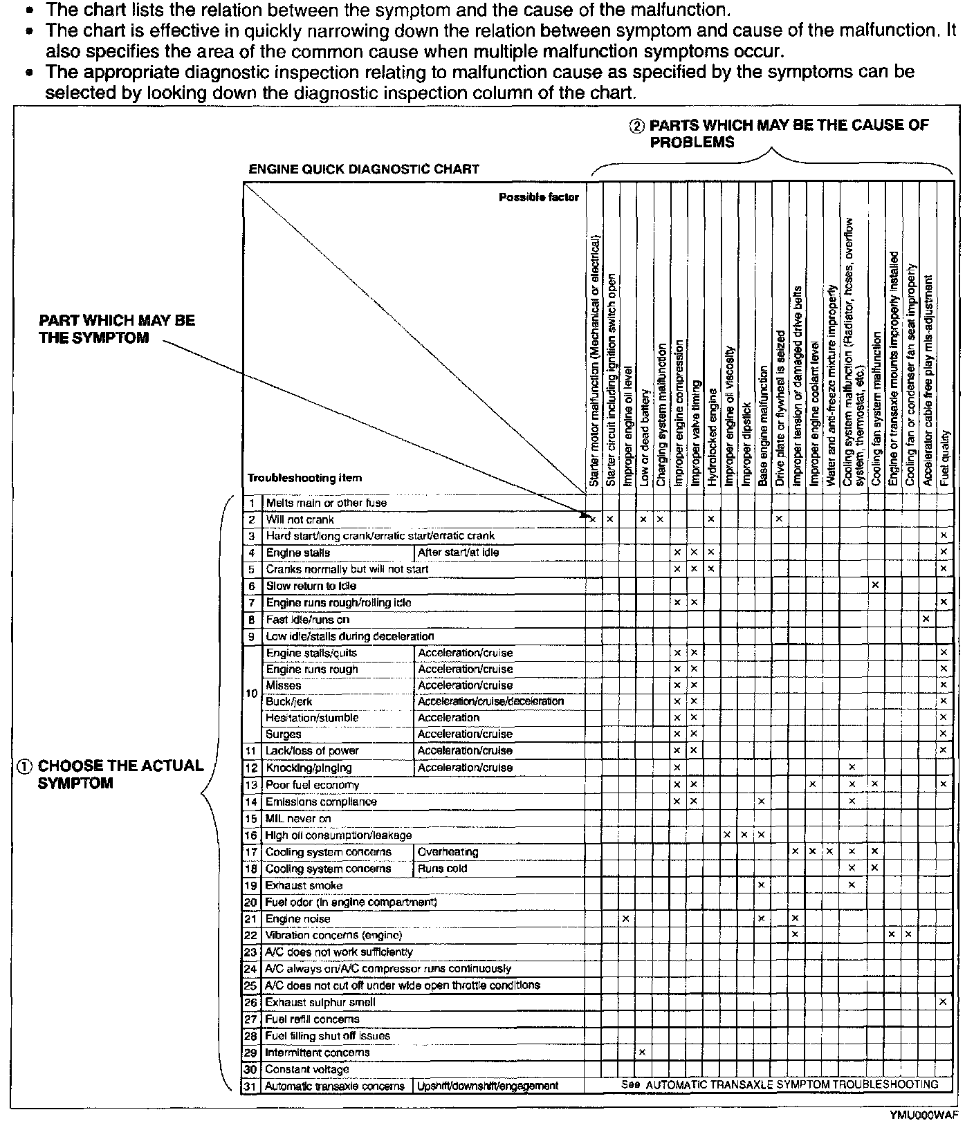 - The quick diagnosis chart lists diagnosis and inspection procedures to be performed specifically relating to the cause of the malfunction.