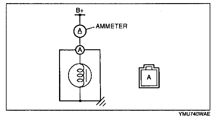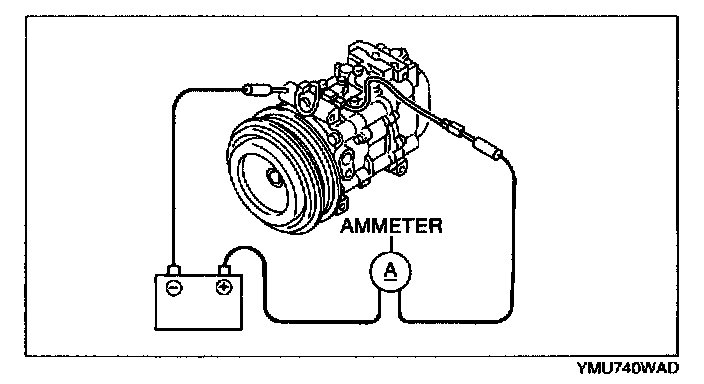 2. Connect battery positive voltage and an ammeter to terminal A of the magnetic clutch and ground to A/C compressor body as shown.