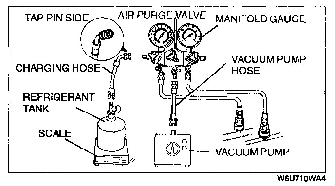 CAUTION: Close the manifold gauge valve immediately after stopping the vacuum pump. If the valve is left open, the vacuum pump oil will back flow into the refrigeration cycle and cause a decrease in the efficiency of the air conditioner.