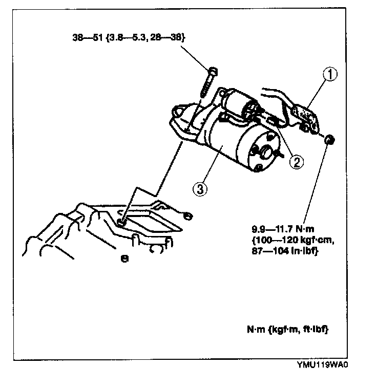 WARNING: When the battery cables are connected, touching the vehicle body with starter terminal B will generate sparks. This can cause personal injury, fire, and damage to the electrical components. Always disconnect the battery before performing the following operation.1. Remove the battery.