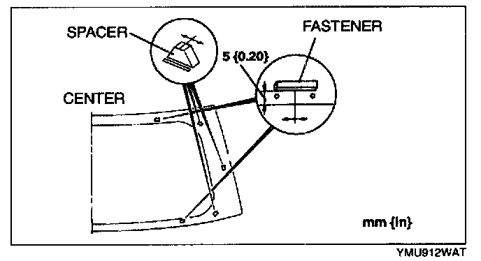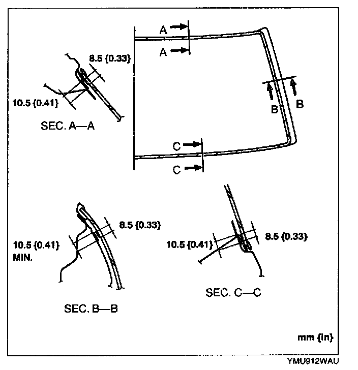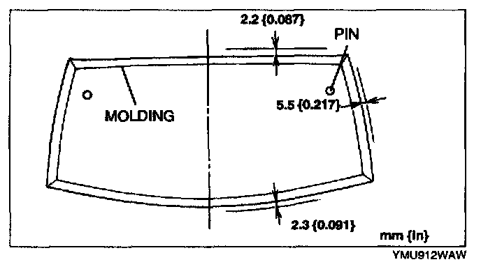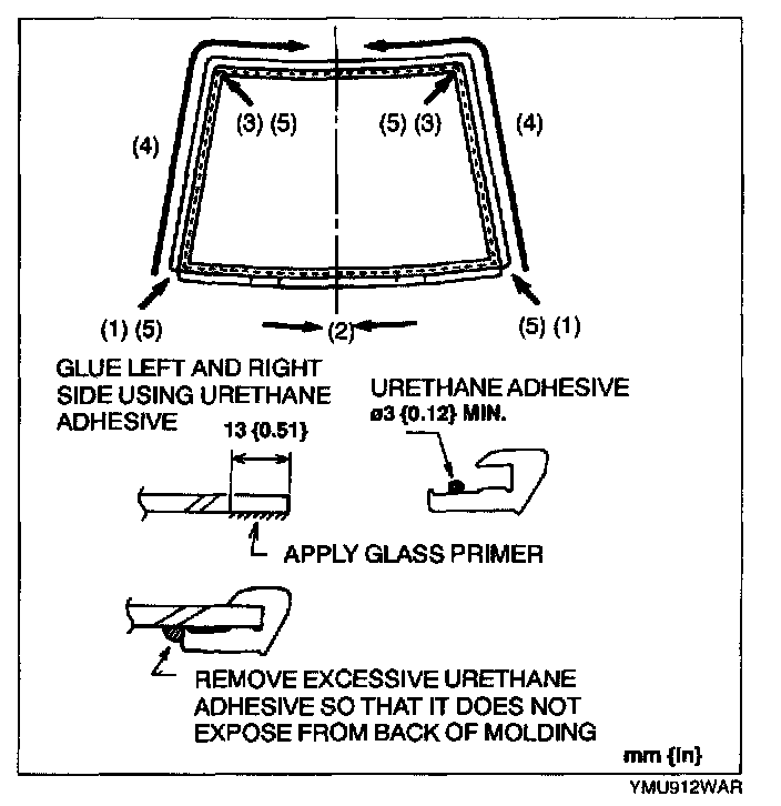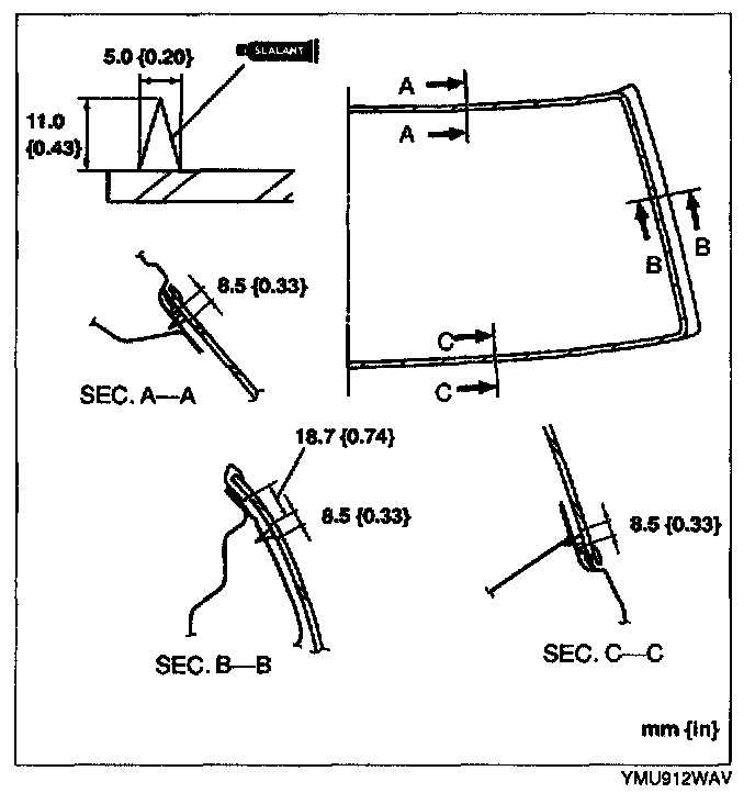 12. Once the primer is dry, apply sealant around the entire circumference to the edge of glass with a 11.0 mm {0.43 in} high and 5.0 mm {0.20 in} wide bead of sealant.