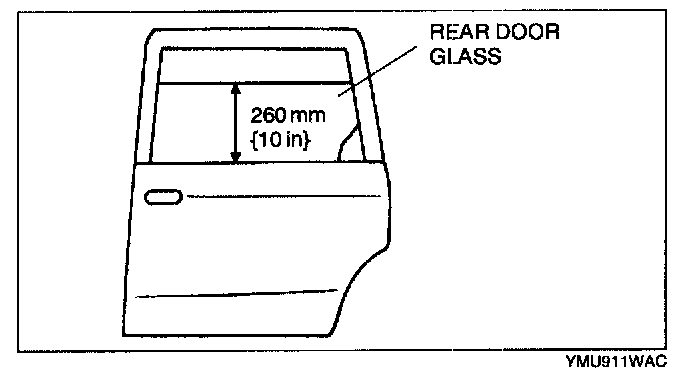 1. Lower or raise the rear door glass so that the distance from the top of the rear door glass at the rear end to the upper pan of the front beltline molding is 260 mm {10 in}.