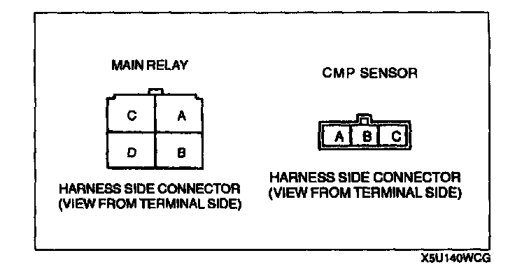 - CMP sensor connector terminal A and main relay terminal D through common connector to GND.