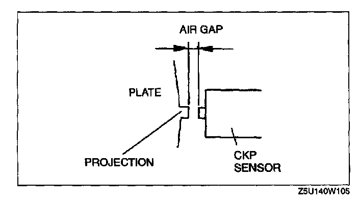 1. Measure the air gap between each four projections of the plate behind the crankshaft pulley and the CKP sensor using a feeler gauge.
