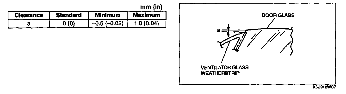 DOOR GLASS ADJUSTMENT1. Adjust the clearance between the upper edge of the door glass and the ventilator glass weather strip.