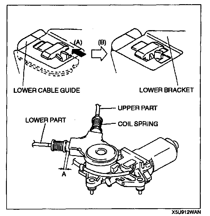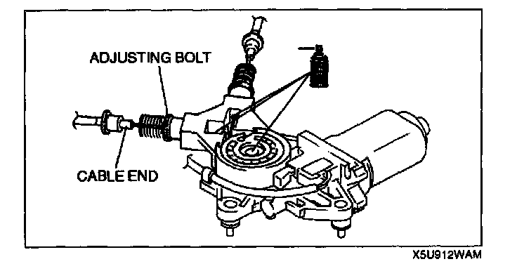 9. For the upper part, pull the (A) part of the cable and for the lower part, pull the (B) part of the cable, and adjust the adjusting bolts making sure the coil springs don't bend.