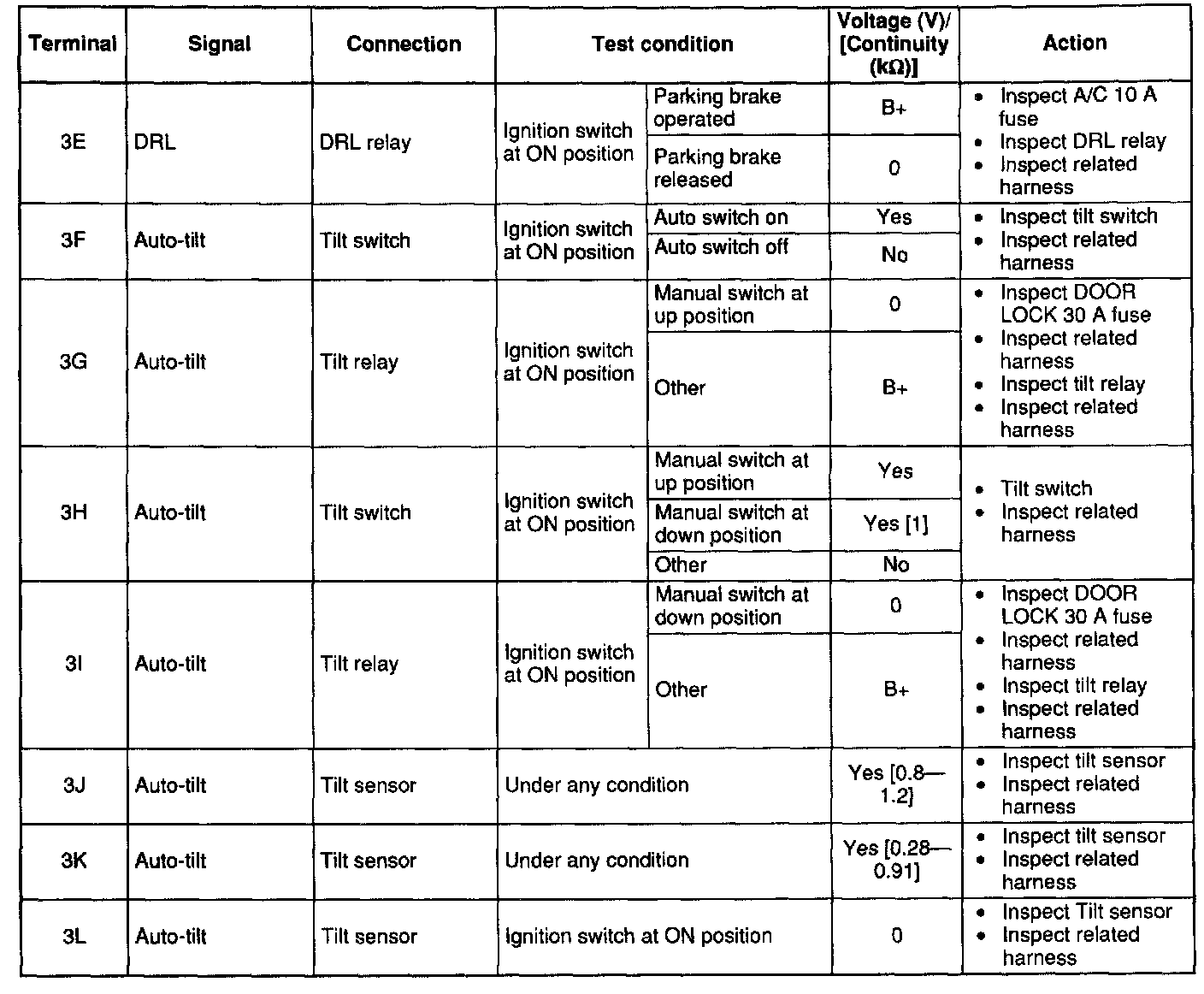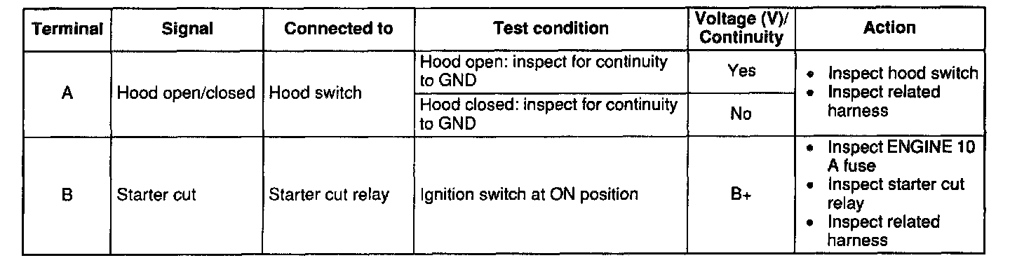 - If not as specified, inspect the parts listed under "Inspection area" and the related wiring harnesses.