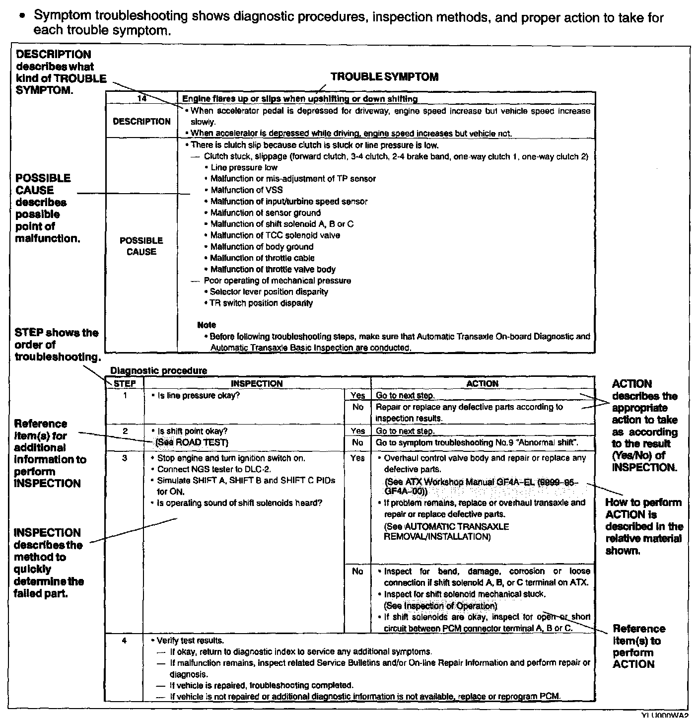 - The quick diagnosis chart lists diagnosis and inspection procedures to be performed specifically relating to the cause of the malfunction.