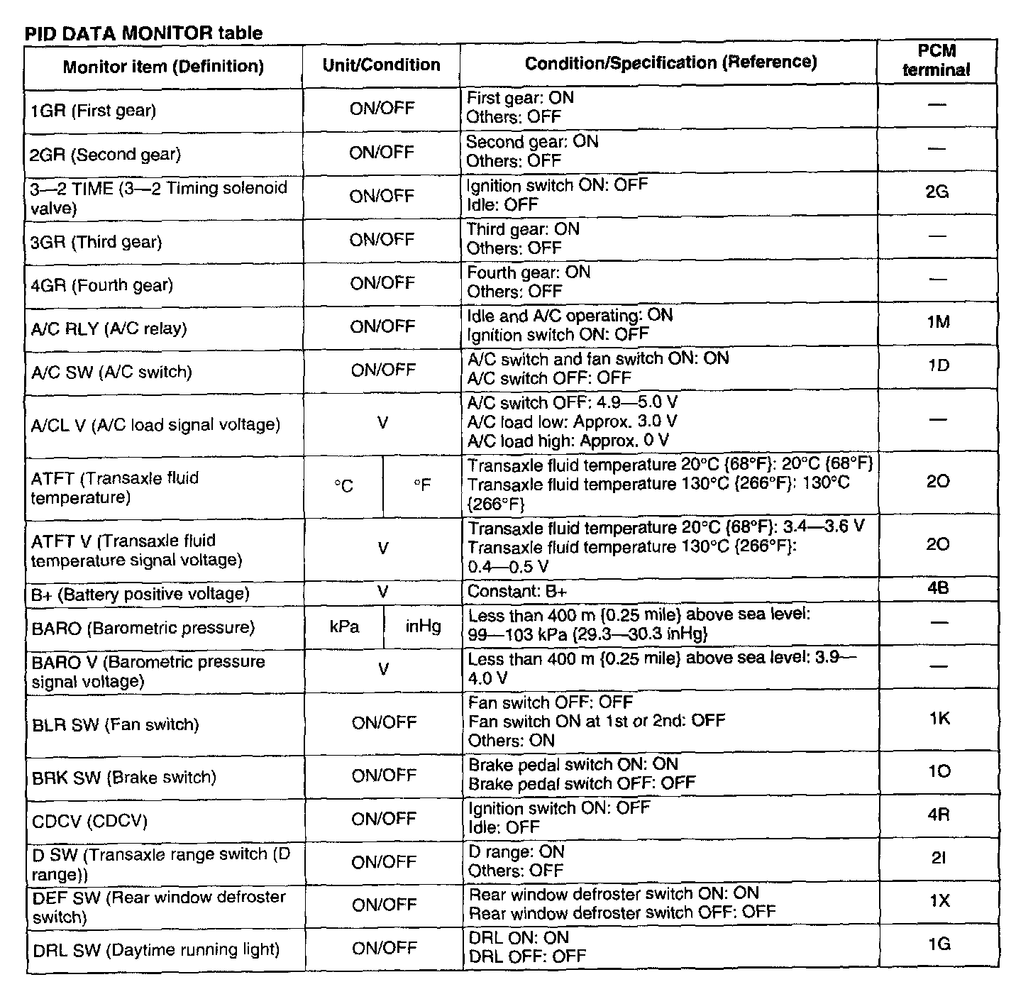 NOTE: The "PID/DATA MONITOR AND RECORD" function is to monitor the calculation value of input/output signals in the PCM. Deviation in the value does not always indicate malfunction in the related input/output devices (sensors and solenoids).