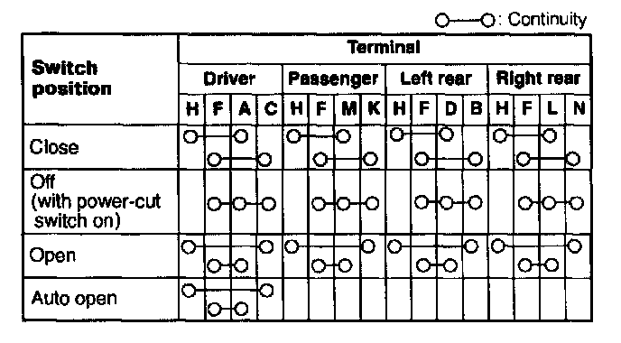 1. Inspect for continuity between the terminals of the power window main switch connector with the main switch in the following positions.2. When inspecting the driver's side, connect the B+ to terminal H and connect the GND to the terminal F.