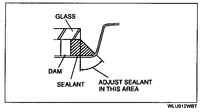 12. Apply an 11 mm {0.43 in} high bead of sealant around the entire circumference of the glass as shown. Keep the bead of sealant smooth and even, shaping it with a spatula where necessary.