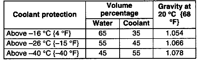 7. Referring to the following chart, select proper volume percentage of the water and coolant. Slowly pour the coolant into the radiator up to the coolant filler port.