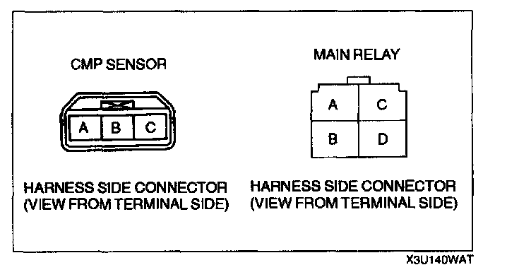 - Power circuit (CMP sensor connector terminal A and main relay terminal D through common connector to GND)