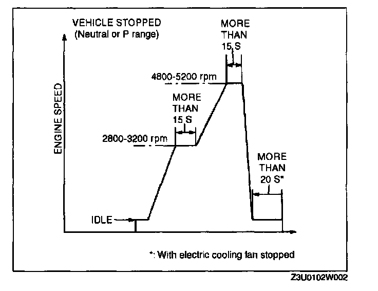 3. Perform no load racing at the engine speed shown in the graph, then idle the engine for more than 20 seconds after the cooling fan stopped. If possible, monitor RPM PID for engine speed and cooling fan status during this procedure.