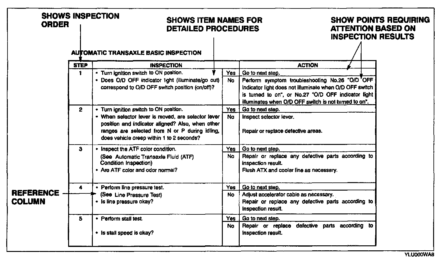 - Although inspections and adjustments are performed according to the reference column procedures, if the cause of the malfunction is discovered during basic inspection, continue the procedures as indicated in the remarks column.