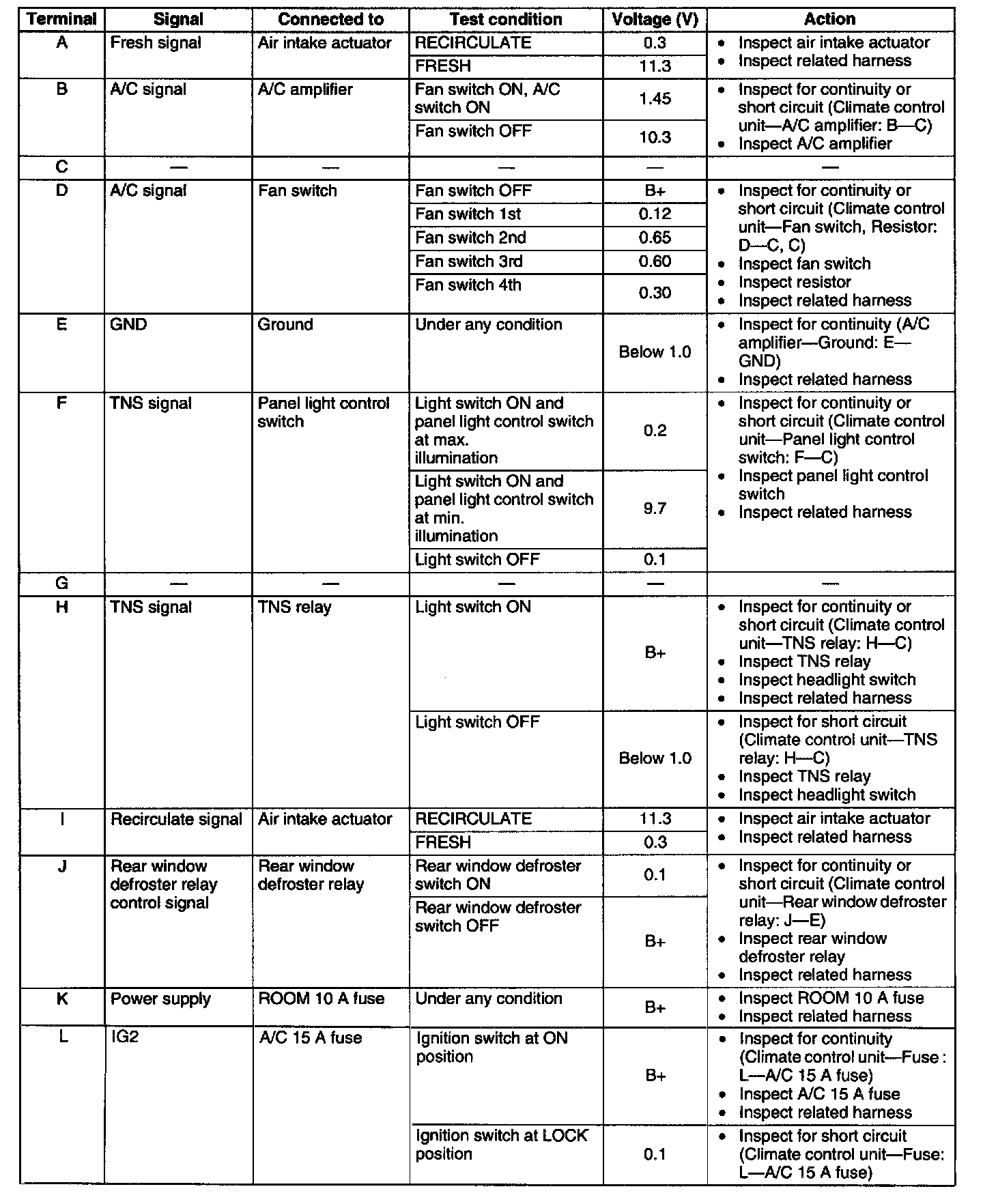 4. Measure the voltage at each climate control unit terminal and refer to the terminal voltage list.