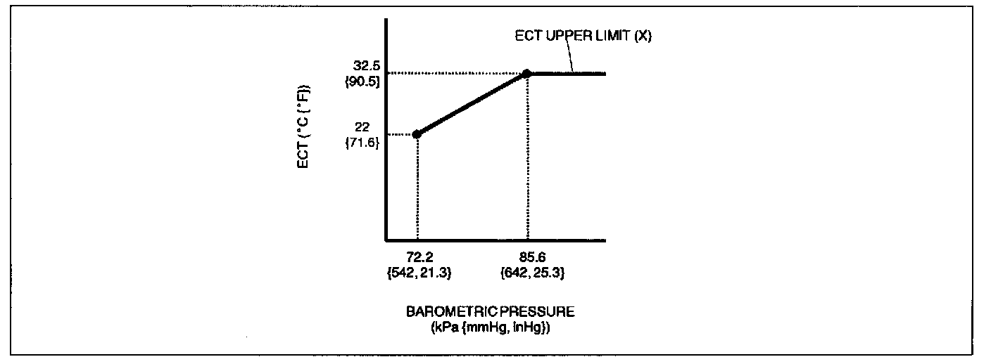 - Engine coolant temperature: -10 °C - X °C {14 °F - X °F} (X, the Engine coolant temperature upper limit, is determined according to the barometric pressure as shown the graph.)