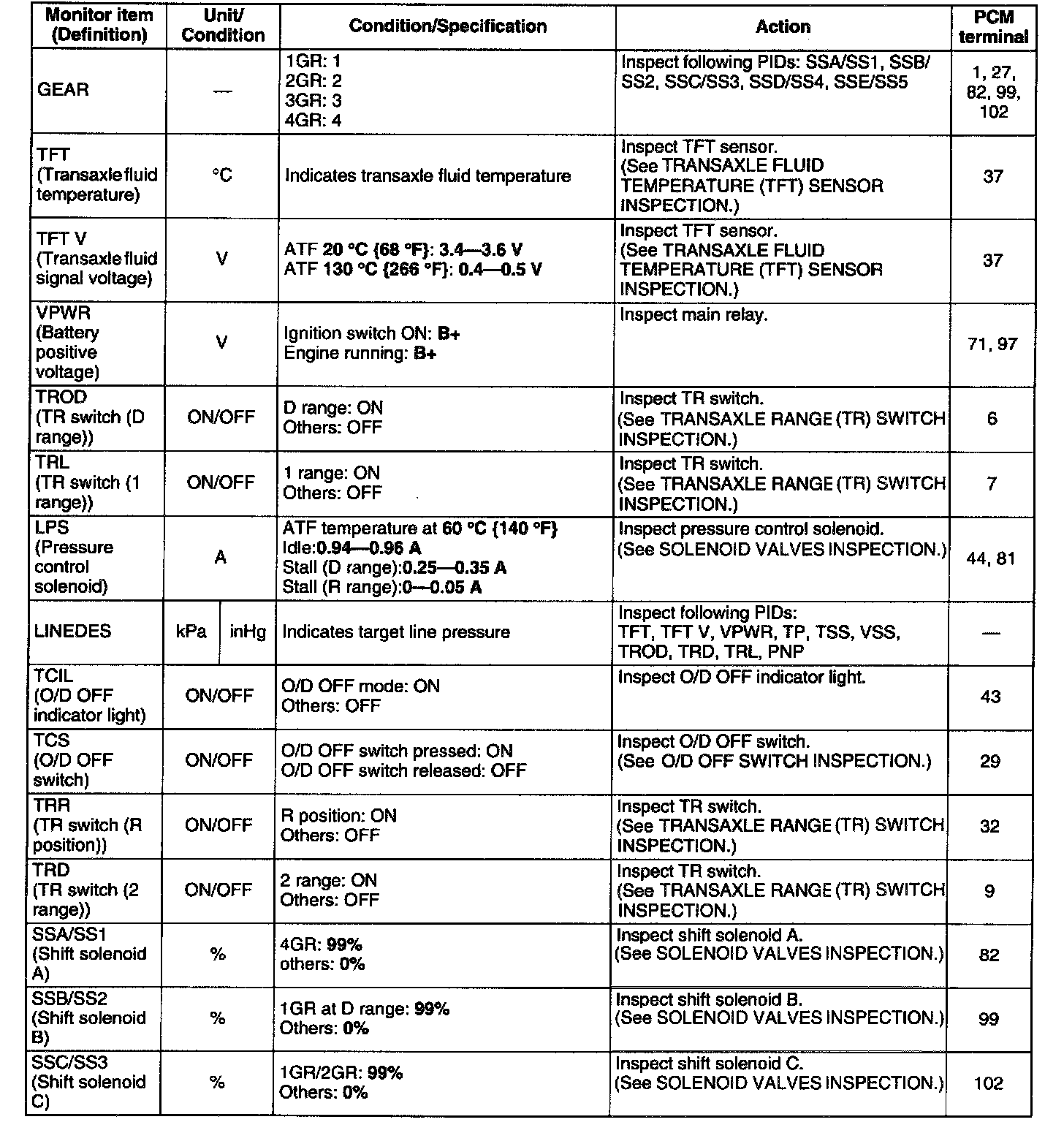 ^ The PID/DATA MONITOR function monitors the calculated value of the input/output signals in the PCM. Therefore, if a monitored value of an output device is out of specification, it is necessary to inspect the monitored value of the input device related to the output device control. Since an output device malfunction is not directly indicated as a malfunction of the monitored value for the output device, it is necessary to inspect the output device individually using the simulation function, etc.