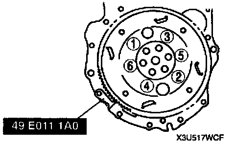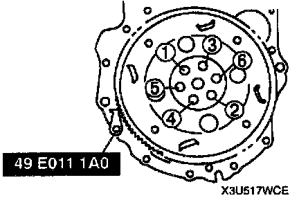 6. Tighten the drive plate installation bolts in 2 or 3 steps as shown.
