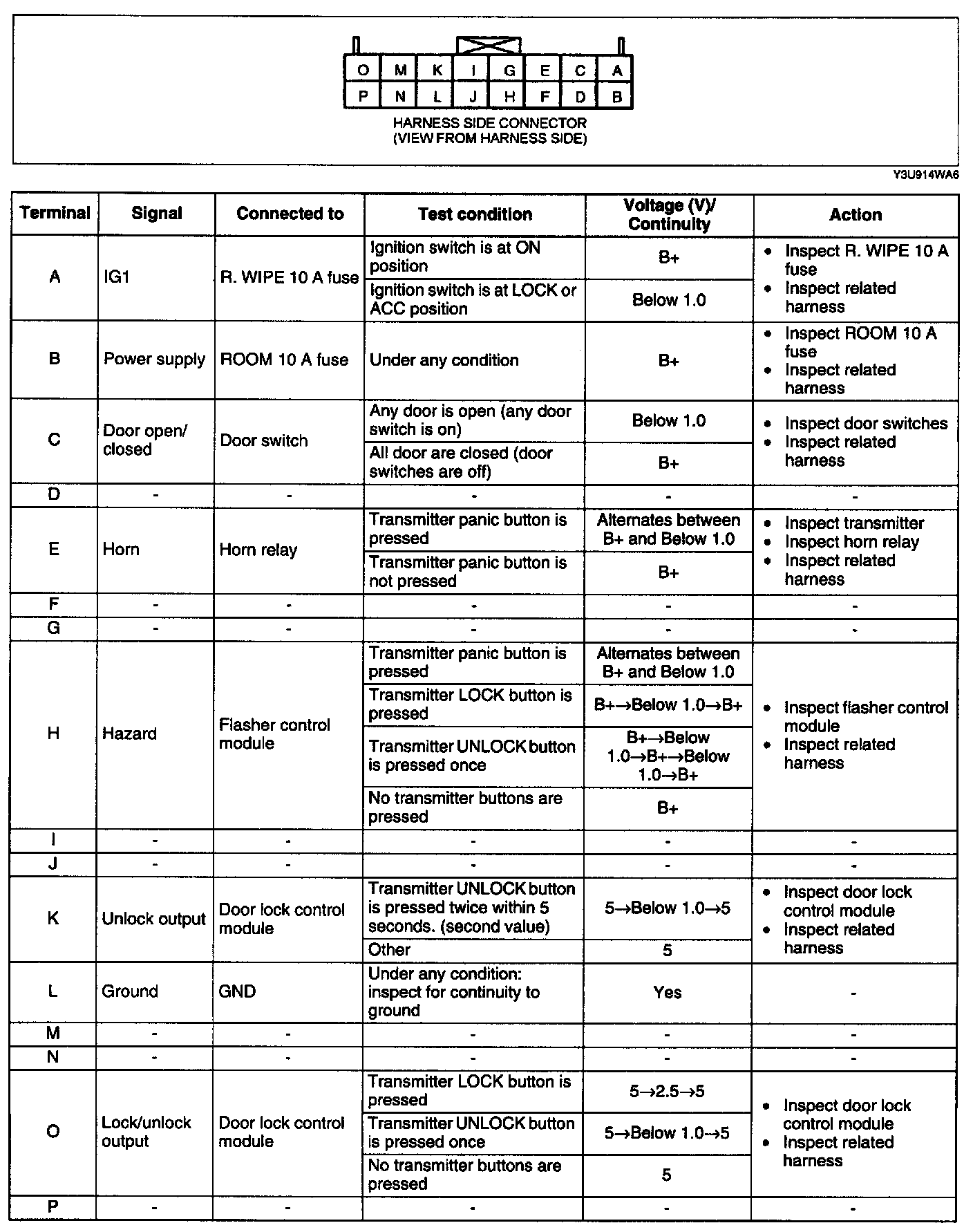 2. Measure the voltage at the keyless control module terminals (other than terminal L) as indicated below. If not as specified, inspect the parts listed under "Action."