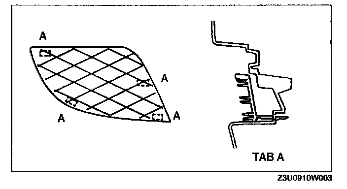 1. Push the tabs of front bumper mesh forward from the back of the front bumper fascia to unhook the front bumper mesh.