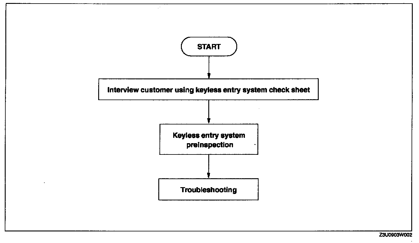 Go to symptom troubleshooting after identifying the specific malfunction by performing a keyless entry system preliminary inspection.