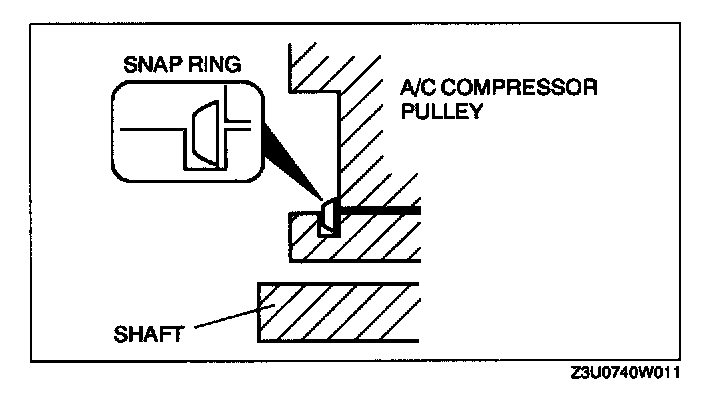 1. When installing a new pressure plate, A/C compressor pulley, stator and thermal protector, or A/C compressor body, replace the snap ring.