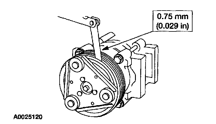 2. Remove the A/C clutch. Add or remove spacers between the A/C clutch and the compressor shaft until clearance is within specification. For additional information, see CLUTCH AND CLUTCH FIELD COIL.