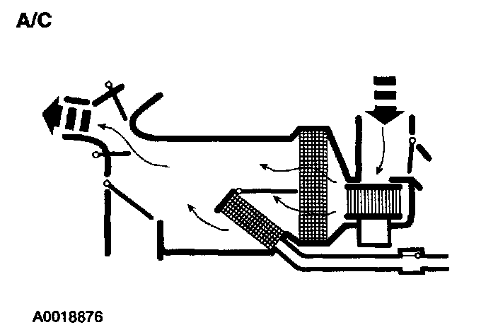 - Air is picked up at the recirculation opening by the blower motor. With the temperature control set for maximum cold, air flows across the A/C evaporator core, diverting past the heater core and then directed into the passenger compartment through the driver-side, passenger-side and center registers.