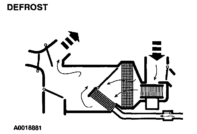 - The defrost airflow door and the vent/register blend door are in the no vacuum position, closing off air-flow to the windshield defroster hose nozzles and driver, passenger and center registers.