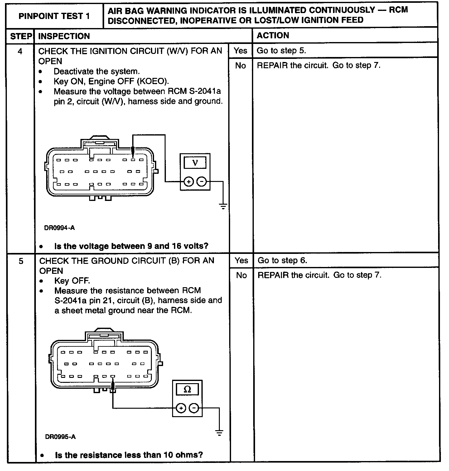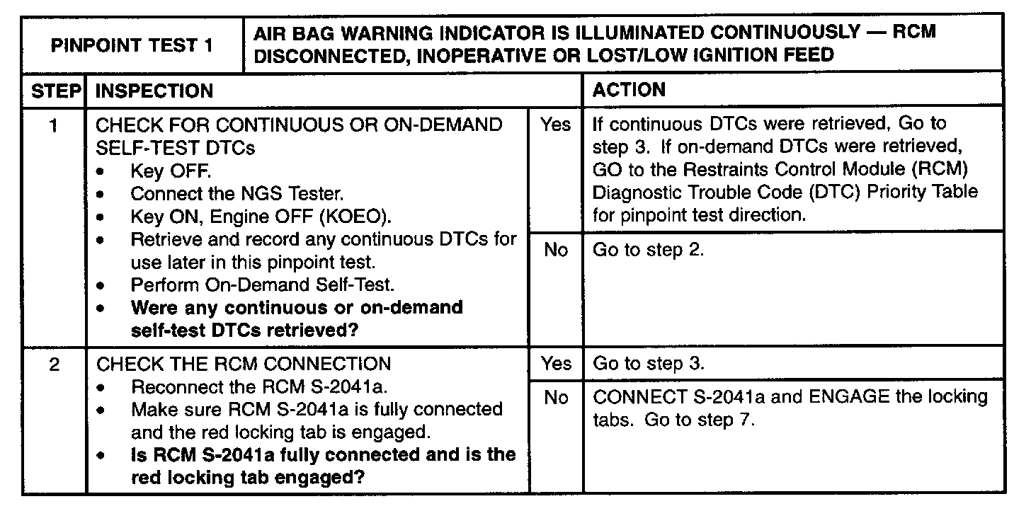 Pinpoint Test 1: Air Bag Warning Indicator Is Illuminated Continuously - RCM Disconnected, Inoperative or Lost/Low Ignition FeedNormal Operation