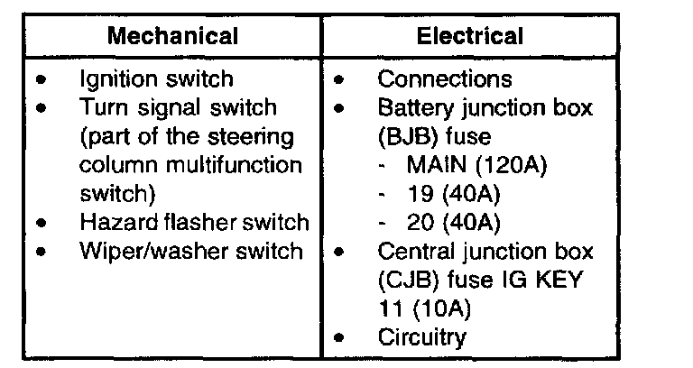 2. Visually inspect the ignition switch and the steering column multifunction switch for damage; refer to the chart.